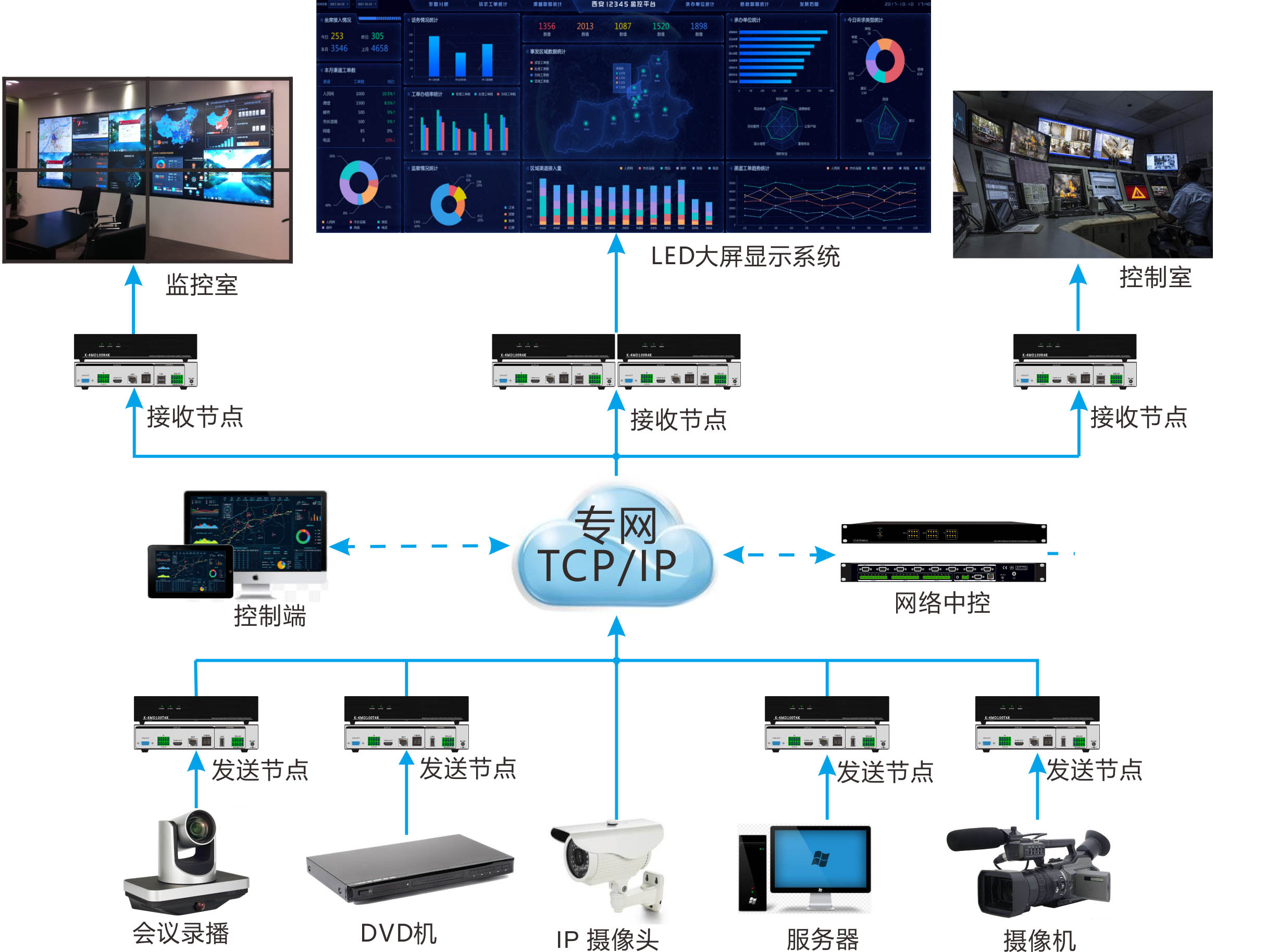 通過控制中心實(shí)現(xiàn)各個(gè) 分區(qū) 之間音頻、視頻互聯(lián)、互通 , 且 可任意切換。