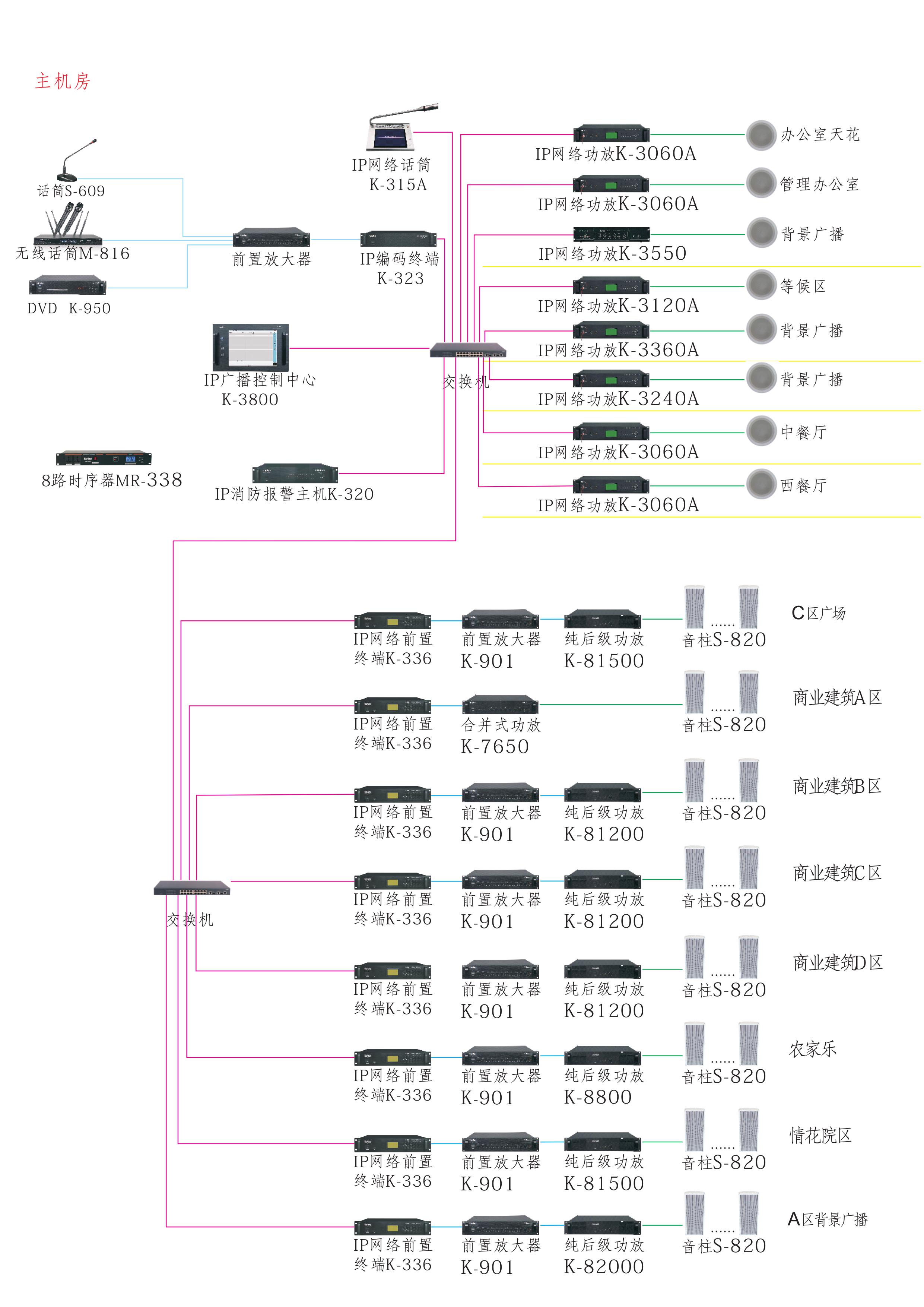 各樓層選用性價(jià)比高的8分區(qū)IP網(wǎng)絡(luò)音頻輸出單元,單臺(tái)終端和功放可以管理8個(gè)樓層音頻信號(hào),同時(shí)可選用6備1的主備切換器。
