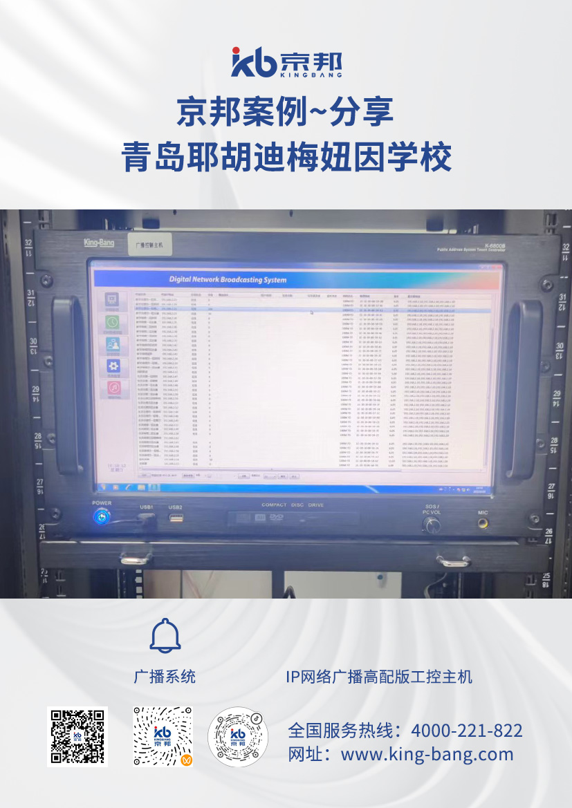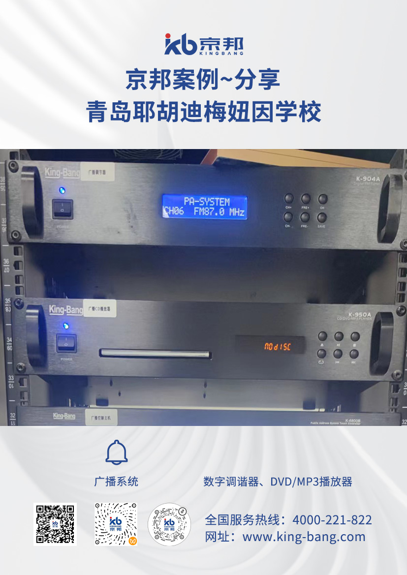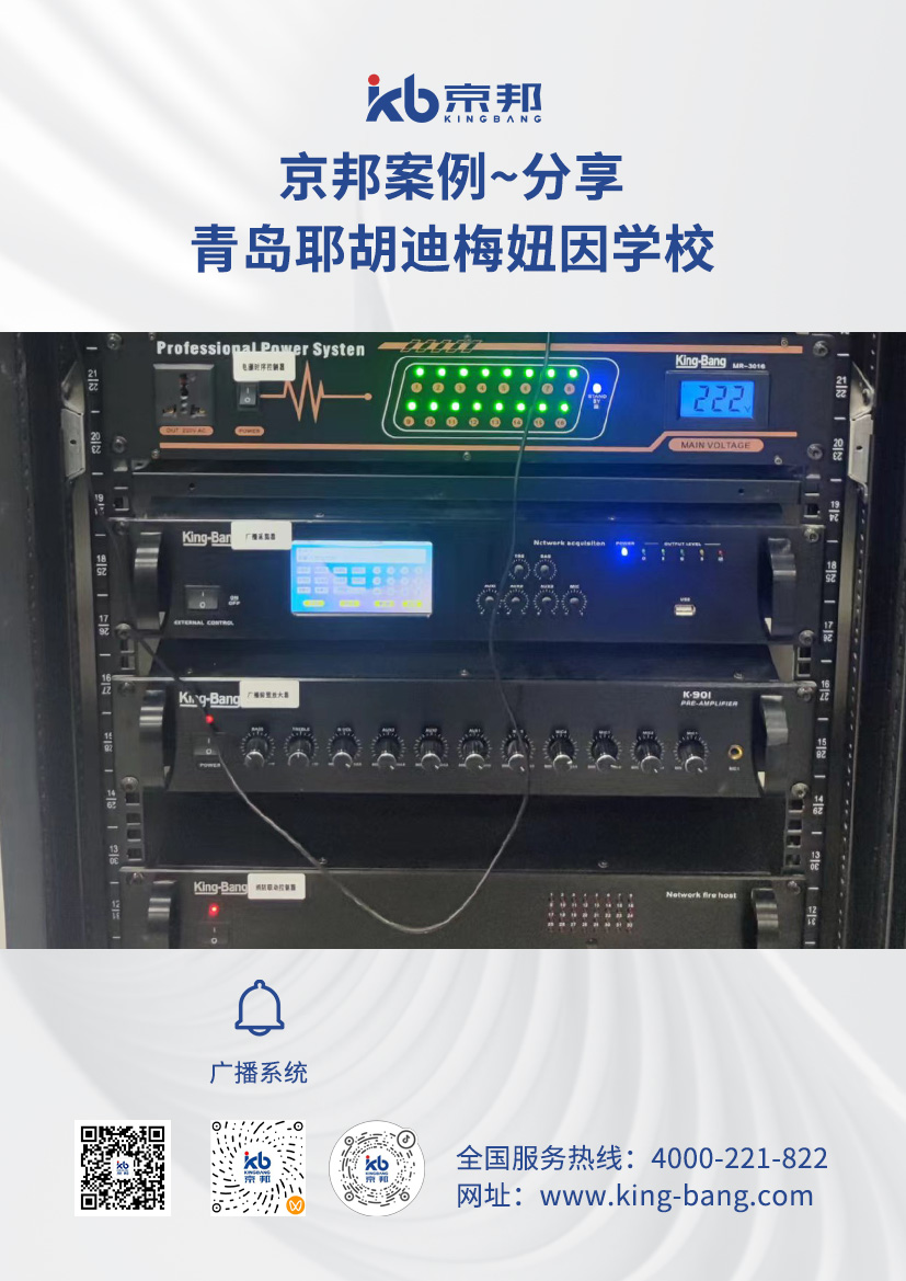 京邦校園廣播系統(tǒng) KING-BANG(京邦)廣播系統(tǒng)成功進(jìn)駐青島耶胡迪梅紐因?qū)W校。廣播系統(tǒng)主要用于各種校園公共場合,如上下課定時打鈴、舉行全校的活動、通知、平日英語聽力教學(xué)以及英語考試的廣播、課間操、播送課間音樂、召開全校大會等。安裝方便以及布線美觀,符合現(xiàn)代學(xué)校的對于設(shè)備先進(jìn)性的要求以及實(shí)用性、對后續(xù)的擴(kuò)展性,廣播尋呼方便,根據(jù)不同的時間在不同的區(qū)域播放不同的背景音樂,尋呼廣播,互不影響,操作簡單方便。