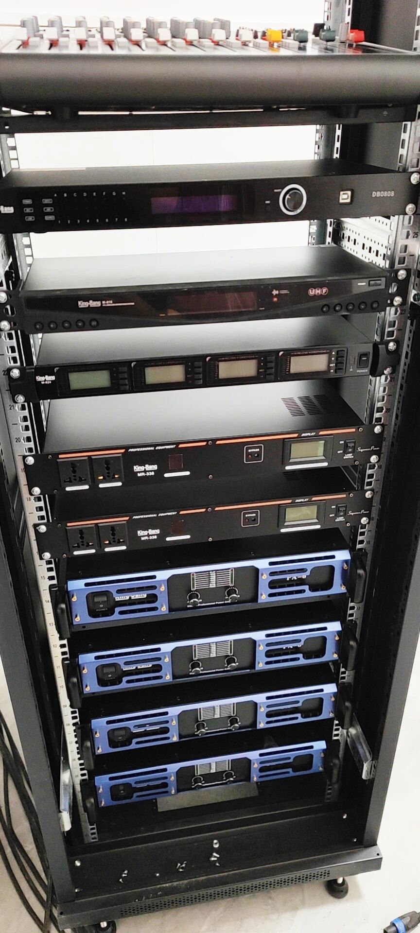 前級的放大和混音輸出、音頻信號處理的設備,如:調音臺、均衡器、反饋抑制器等設備;放大設備——指對經過調控設備混音輸出、信號處理后的信號進行后級功率放大設備,這里指專業功率放大器;重放設備——指將經過后級功率放大器放大的音頻信號進行電—聲轉換并釋放表現出來人耳可懂的聲頻信號的設備,這里指揚聲器;