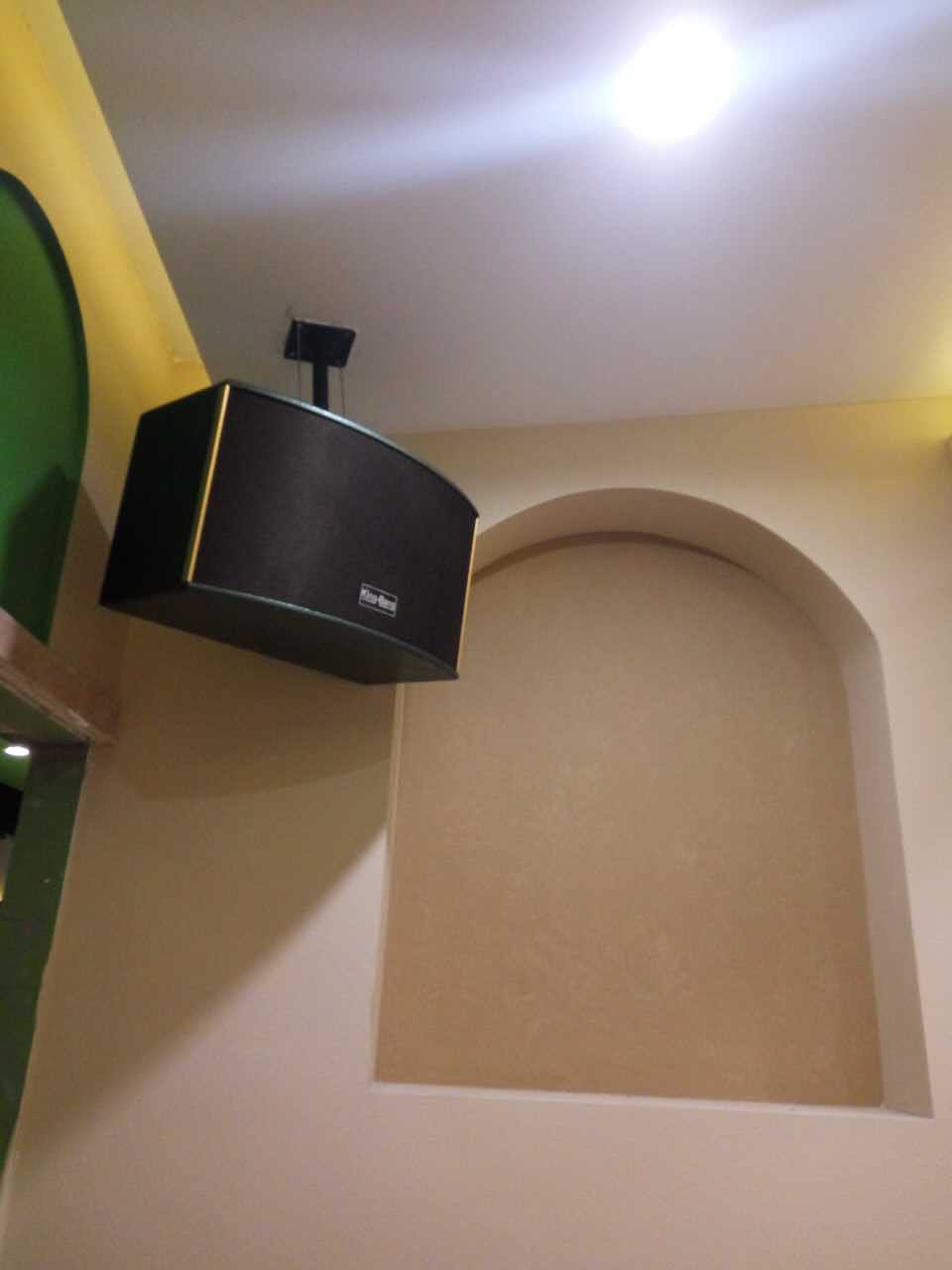 整個系統包括KT-10的兩分頻單10"卡包箱以及S-166的優質的天花喇叭,所有音箱由兩臺K-7500合并式功放500W,DSP-100的專業數碼HI房卡拉OK前級。整個系統主要用于背景音樂的播放。